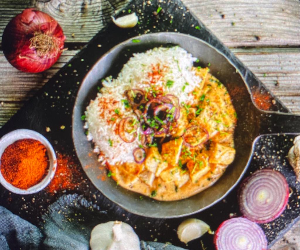 - Zwiebel und Knoblauch in einer Pfanne anbraten und Hähnchenbrust